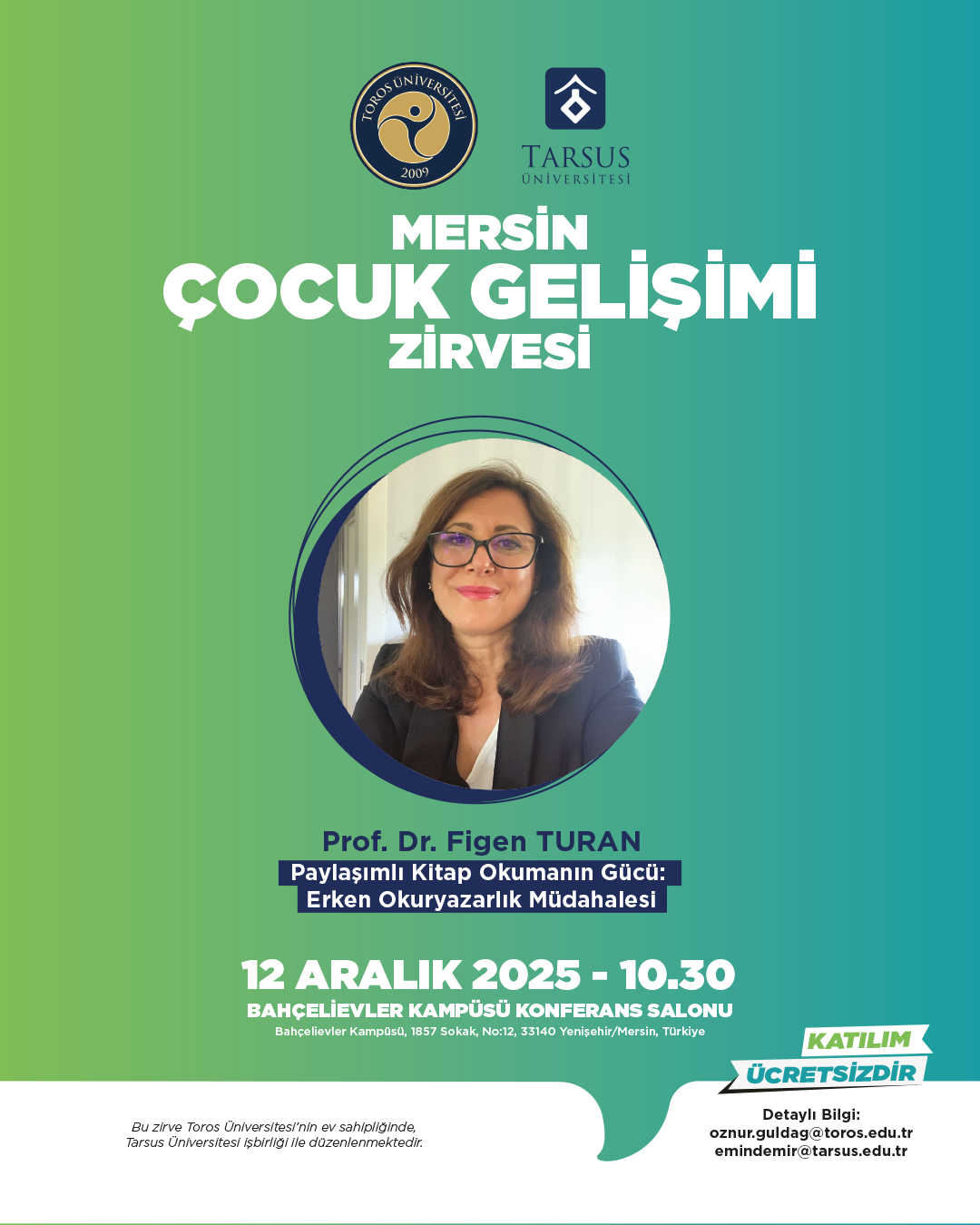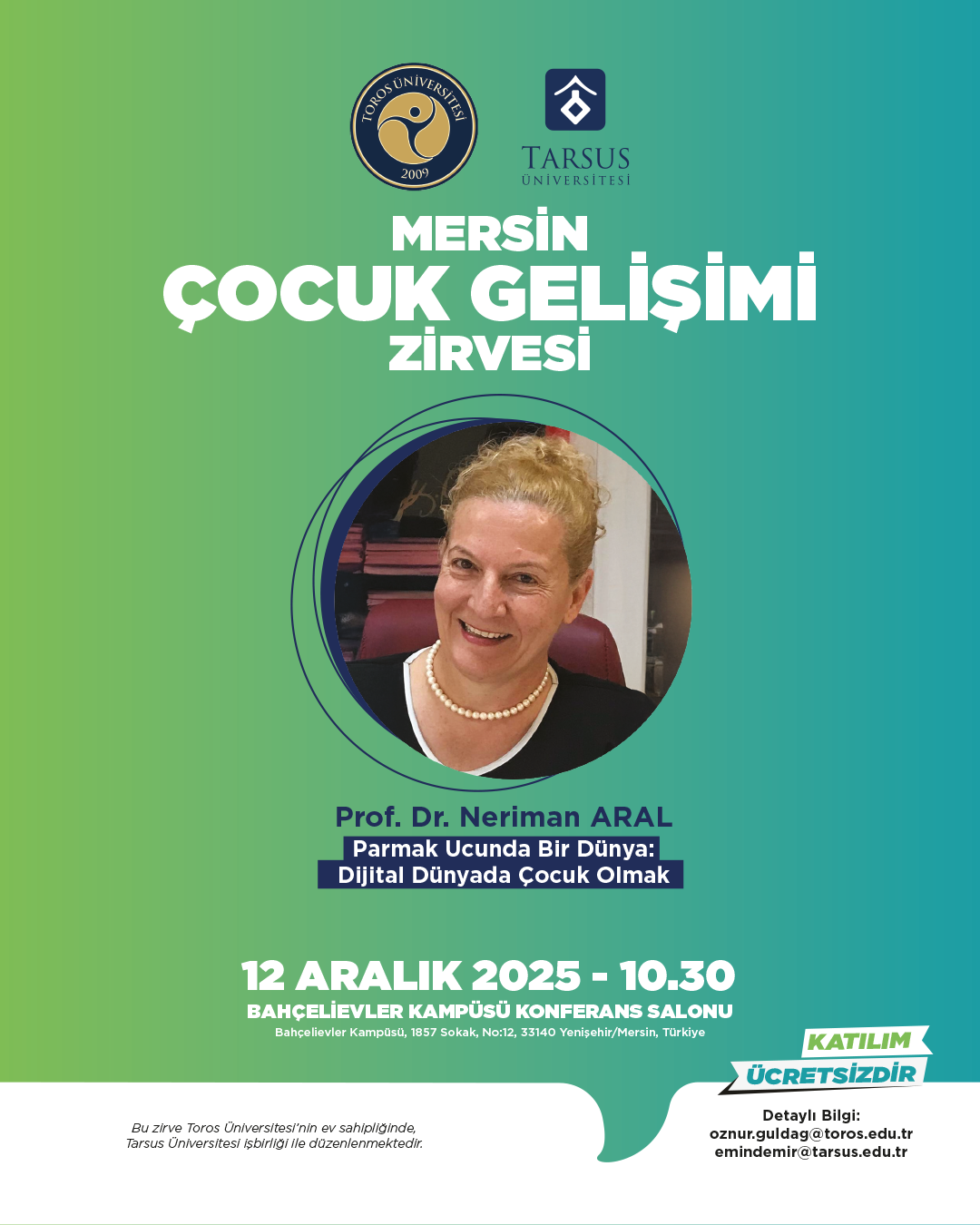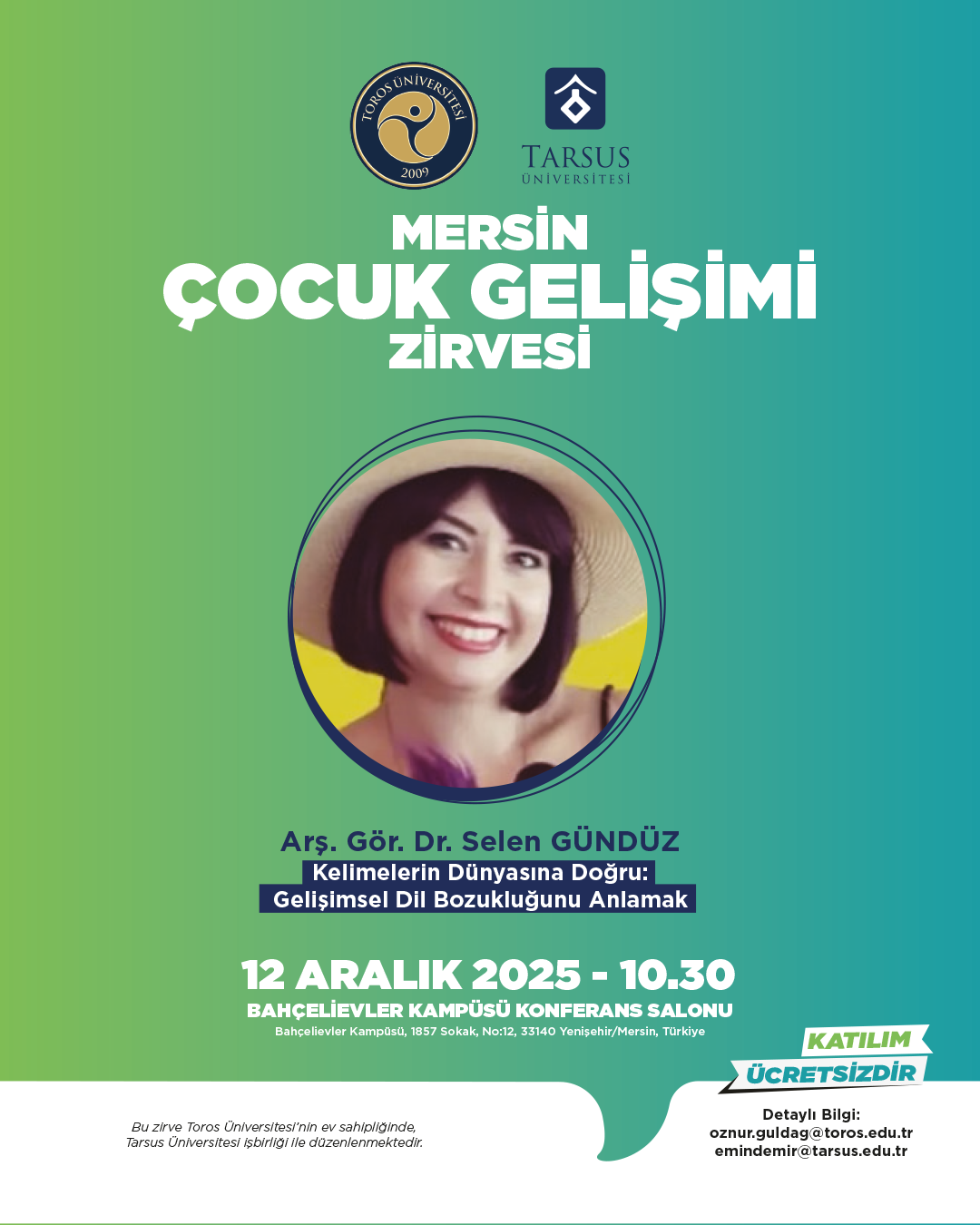 Toros Üniversitesi ev sahipliğinde ve Tarsus Üniversitesi iş birliğiyle düzenlenecek olan Mersin Çocuk Gelişimciler Zirvesi, 12 Aralık 2025 tarihinde Bahçelievler Kampüsü Konferans Salonu’nda gerçekleştirilecektir. Etkinlik kapsamında; dijital dünyanın çocuk gelişimine etkileri, erken okuryazarlık becerileri, aile çalışmaları ve gelişimsel değerlendirme gibi alanlarda uzman akademisyenler sunumlarını gerçekleştirecek ve güncel bilimsel yaklaşımlar paylaşılacaktır.