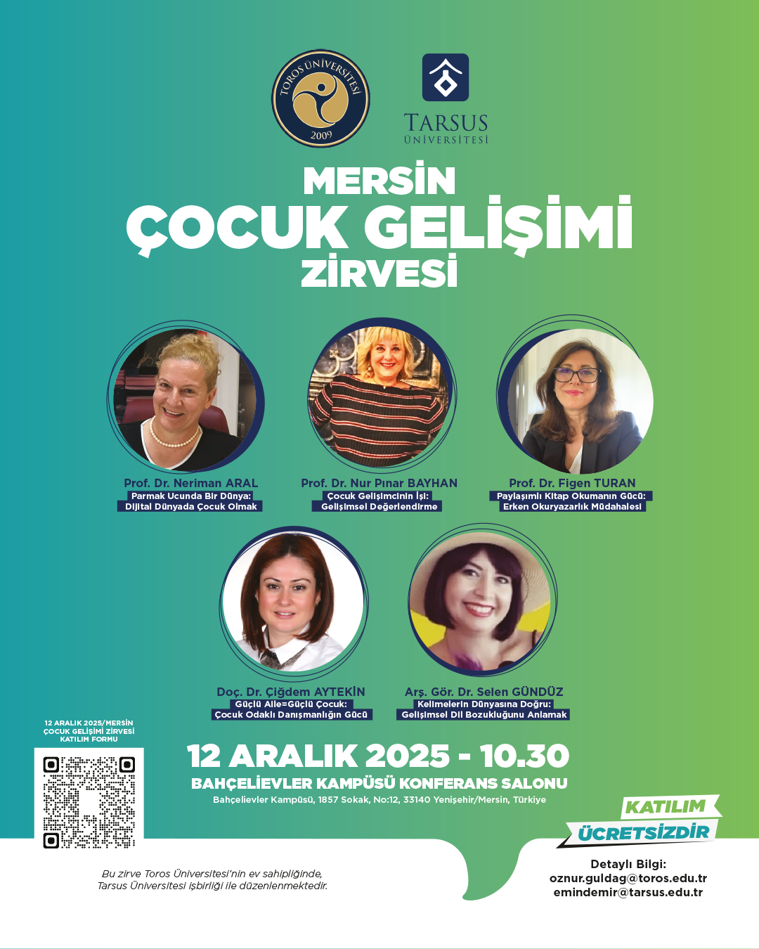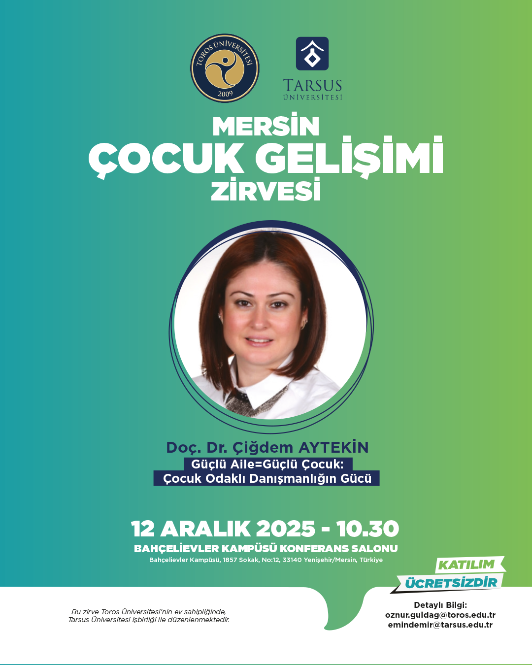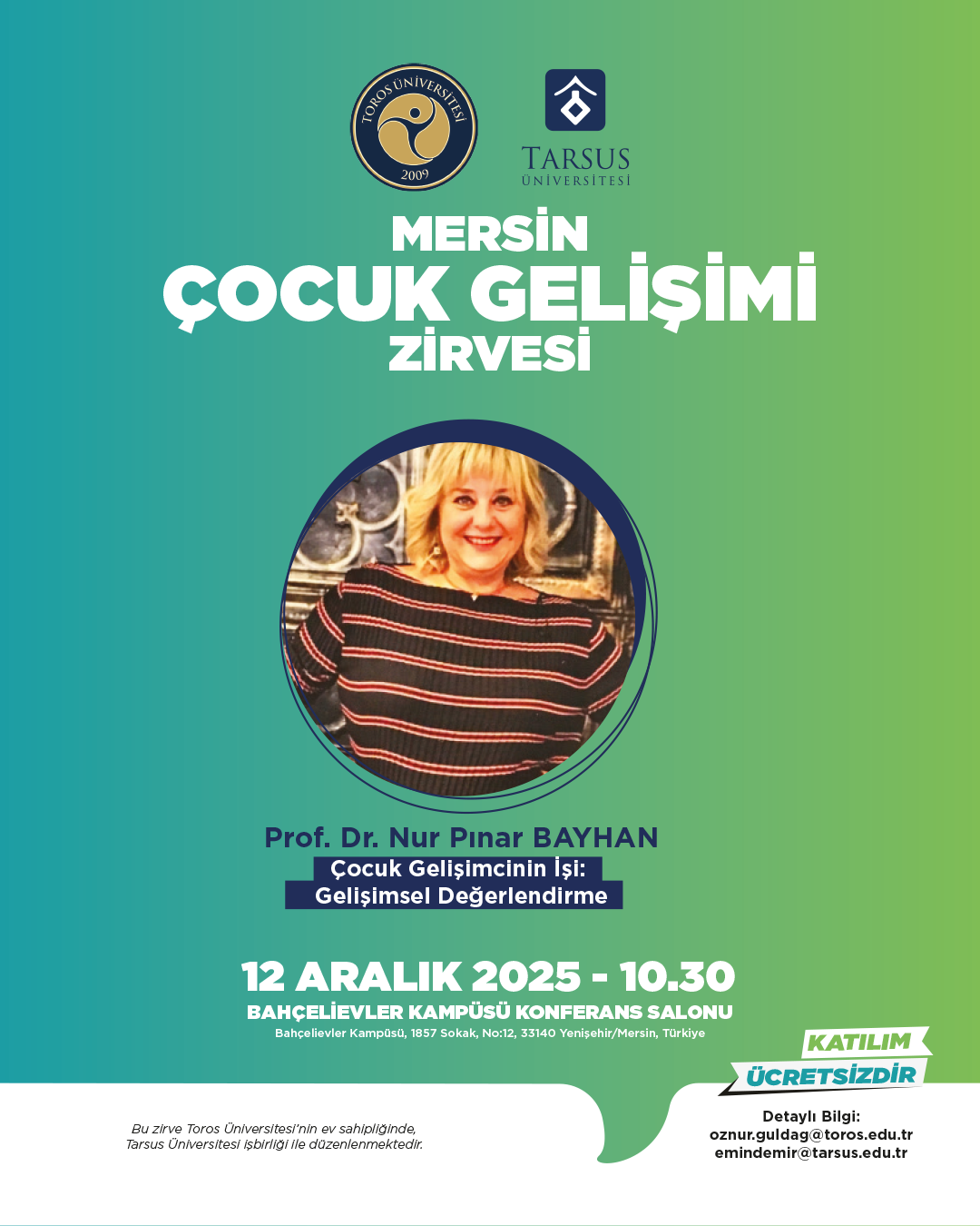 Toros Üniversitesi ev sahipliğinde ve Tarsus Üniversitesi iş birliğiyle düzenlenecek olan Mersin Çocuk Gelişimciler Zirvesi, 12 Aralık 2025 tarihinde Bahçelievler Kampüsü Konferans Salonu’nda gerçekleştirilecektir. Etkinlik kapsamında; dijital dünyanın çocuk gelişimine etkileri, erken okuryazarlık becerileri, aile çalışmaları ve gelişimsel değerlendirme gibi alanlarda uzman akademisyenler sunumlarını gerçekleştirecek ve güncel bilimsel yaklaşımlar paylaşılacaktır.